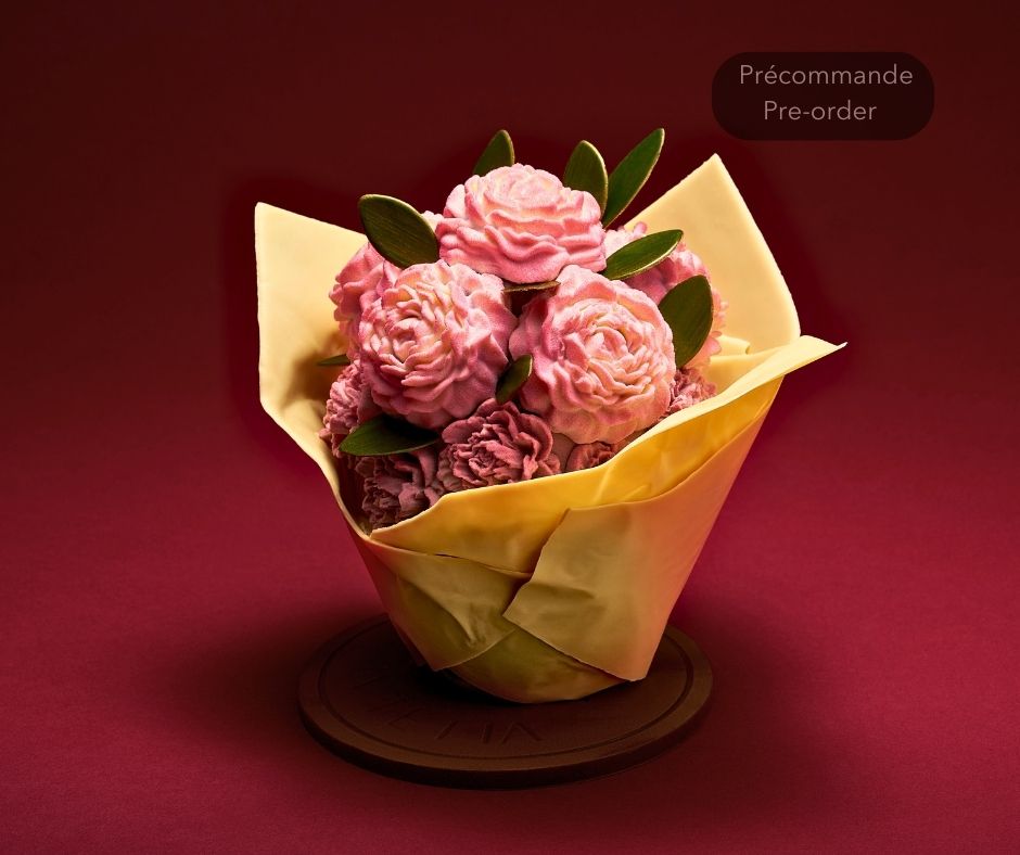 Cette année, l’Œuf de Pâques se réinvente dans une interprétation florale : un somptueux bouquet de pivoines renfermant un œuf en chocolat noir Manjari bi-couche, garni d’un délicieux praliné noisette fondant.